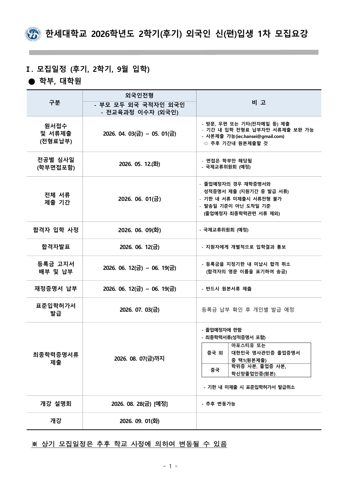2026학년도 2학기(후기) 외국인 특별전형 신(편)입생 입학 1차 모집요강(국문).pdf