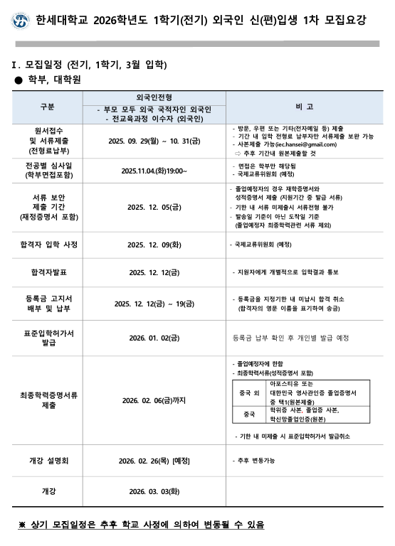 2026학년도 1학기(전기) 외국인 특별전형 신(편)입생 1차 모집 안내